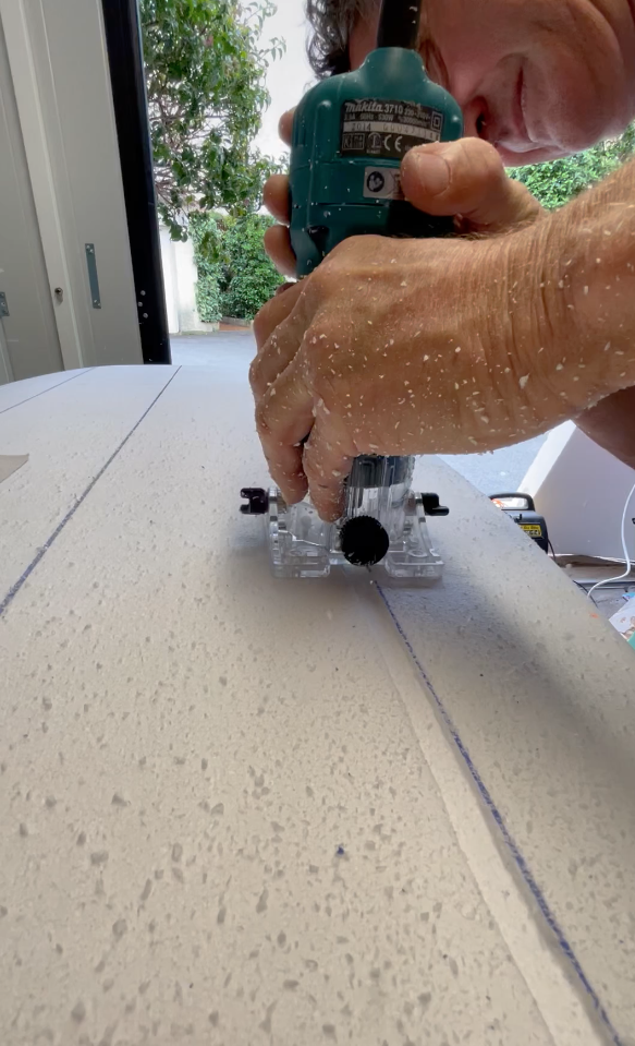 - décaisser les zones sur le pain qui supporteront les plaques de pvc de renforts à la défonceuse; terminé le travail de la zone avec un petit rabot trouvé ici par exemple .